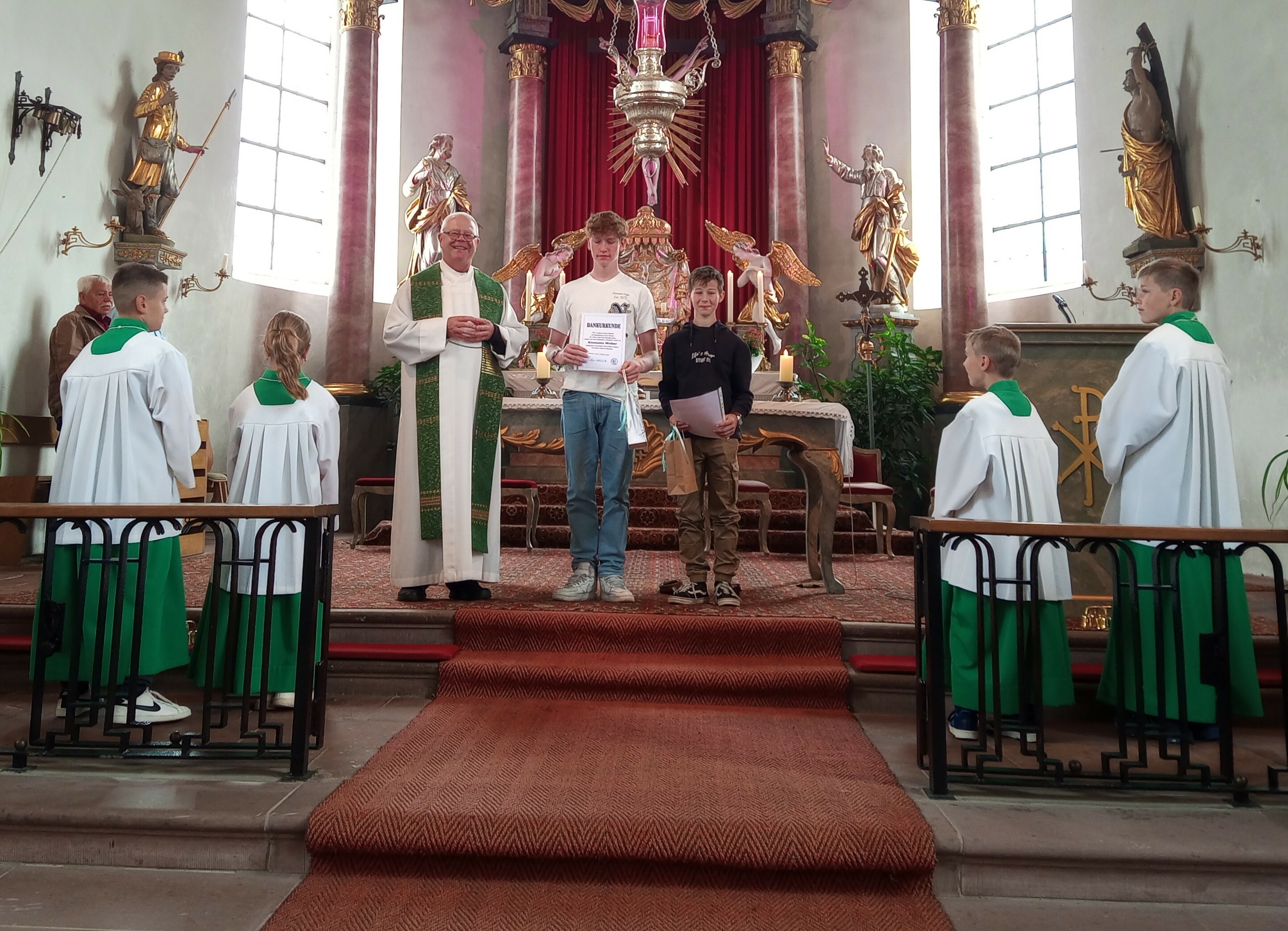 Pfarrer Fröhlich bedankte sich während des Gottesdienstes bei den beiden für ihren langjährigen Einsatz und konnte gleichzeitig mit Lotte Dosch und Jonas Berberich zwei neue Ministranten willkommen heißen.