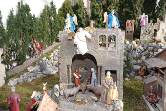 Die Gesamtszene der Neunkirchener Krippe zeigt nicht nur den Stall von Bethlehem, sondern auch Gebäudeteile der Stadt Jerusalem und aus Nazareth sowie Kana.