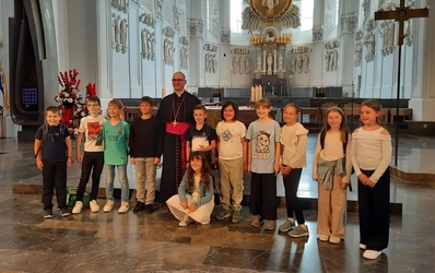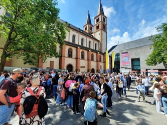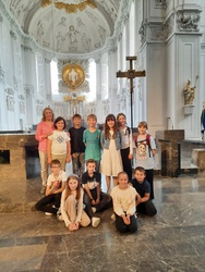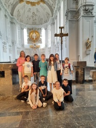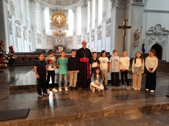 Auf dem Kiliansplatz fand anschließend eine Begegnung der Gäste und des Bischofs statt. Im Anschluss gab es auf dem Domplatz eine kleine Stärkung bevor es mit Anni Schlegel, die zur Freude aller Kids als Betreuerin dabei war, zur einstündigen, spannenden Dom-Rallye. Spielerisch und mit viel Freude erkundeten sie dabei die Geheimnisse des Doms.
