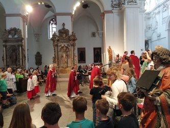 Um 10.30 Uhr zog Bischof Jung mit den Konzelebranten, Ministranten und Ministrantinnen an den insgesamt 1400 Kommunionkindern und ihren Betreuern vorbei. Trotz dieser großen Kinderschar herrschte eine unglaubliche Stille, als er den Gottesdienst mit einem gemeinsamen Gebet eröffnete.