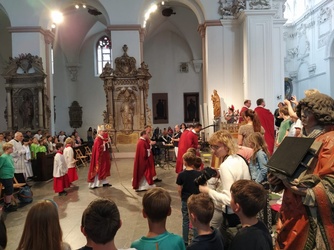 Der Höhepunkt des Tages war die Ausstellung der Schädelreliquien der Frankenapostel Kilian, Kolonat und Totnan in einem kunstvollen Schrein – ein Moment, der bei den Kindern einen bleibenden Eindruck hinterließ.