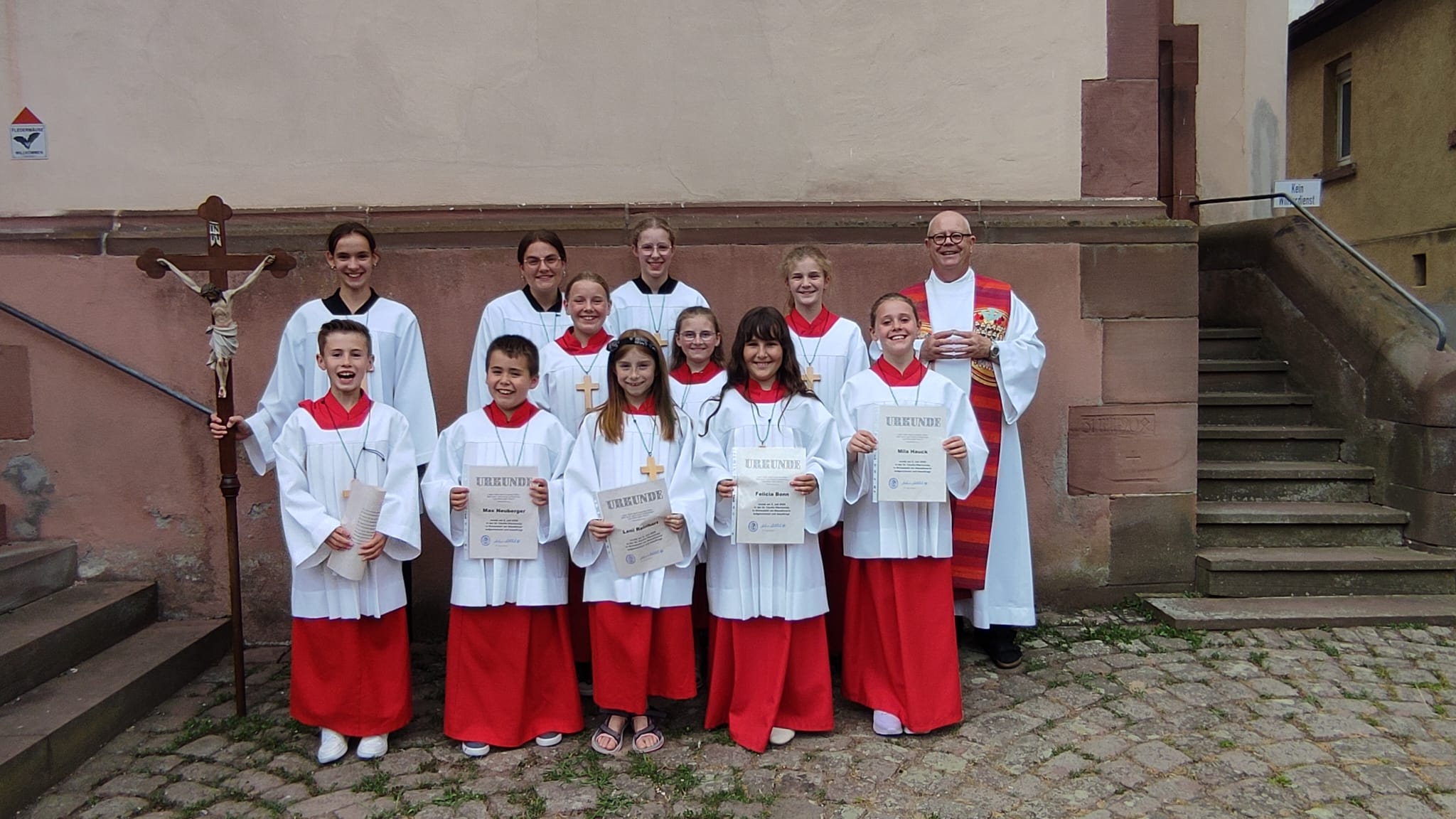 In einem Gottesdienst bekamen sie durch Pfarrer Artur Fröhlich und den beiden Oberministrantinnen Greta und Johanna feierlich ihre Urkunde und ihr Ministrantenkreuz verliehen.