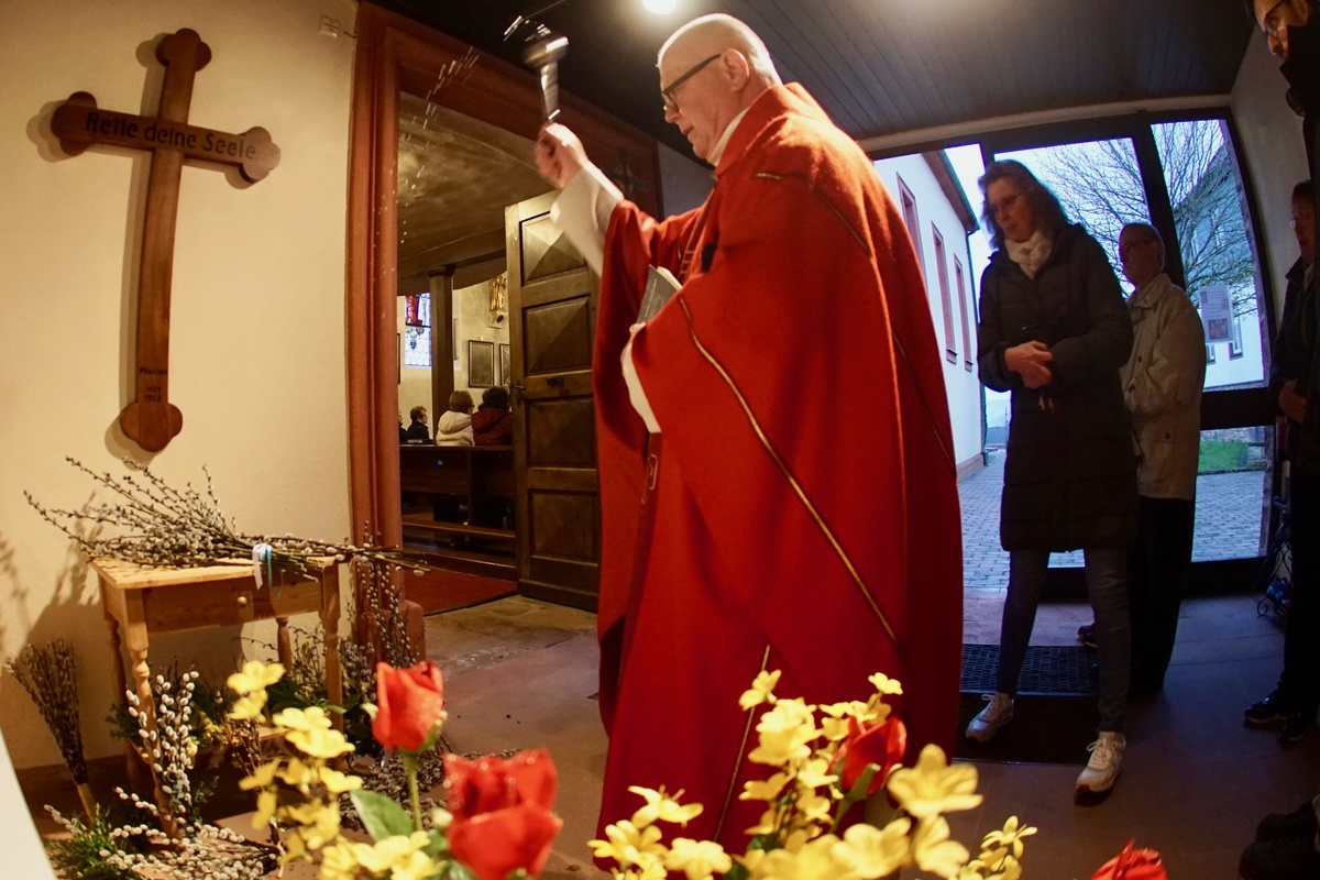 Vor den Gottesdiensten der Eichenbühler Pfarreiengemeinschaft St. Antonius Erftal und Höhen wurden die Palmen oder Buchszweige in Heppdiel von Pfarrer Artur Fröhlich und in Eichenbühl von Pfarrvikar Krzysztof Winiarz geweiht und anschließend oft als Segen mit nach Hause genommen. Sie sollen das Heim schützen und an das Vertrauen auf Gottes Beistand erinnern.