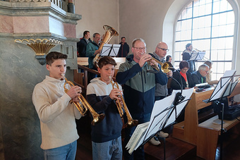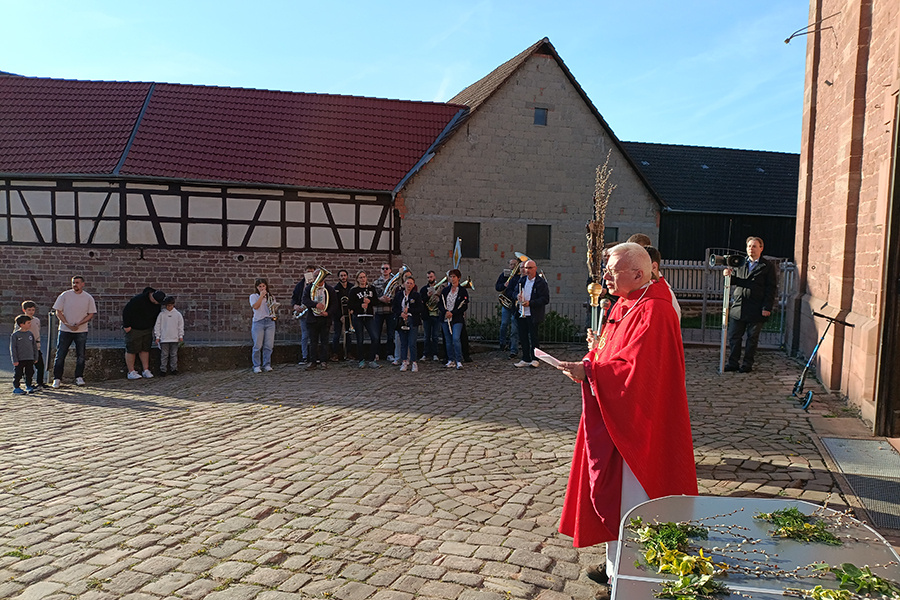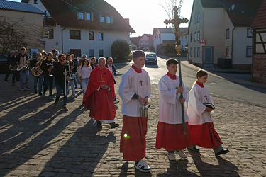 Palmweihe: Neunkirchner Minis boten gegen eine Spende Palmzweige an. Die Palmprozession wurde musikalisch vom Musikverein Bavaria Neunkirchen begleitet.